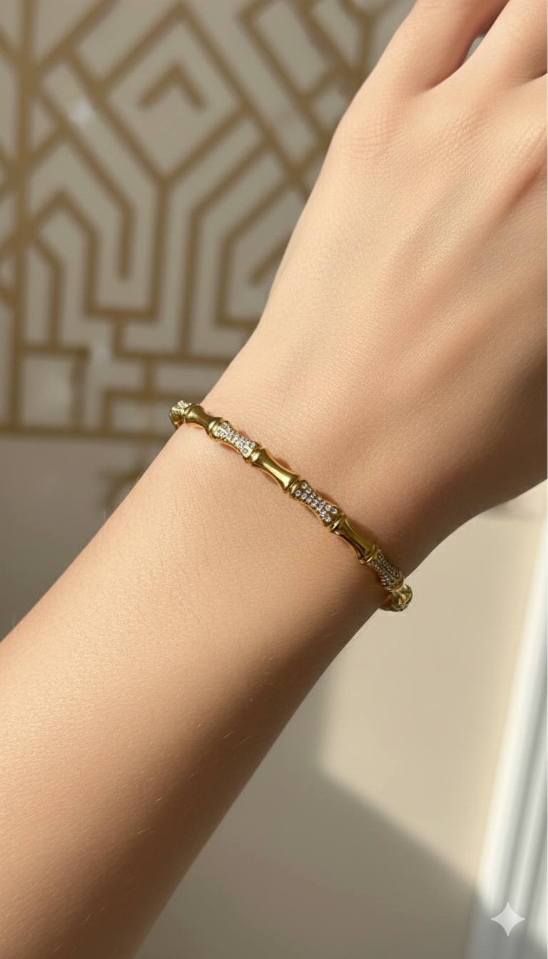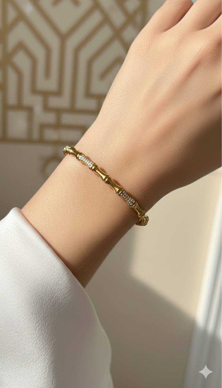 "دعي معصمك يتحدث بلغة الأناقة مع هذه التحفة الفنية. تصميم انسيابي ساحر مستوحى من "البامبو"، حيث يلتقي الذهب المصقول بلمعانه الدافئ مع بريق أحجار الزركون المتلألئة كقطرات الندى.